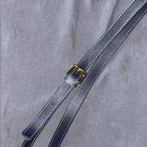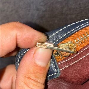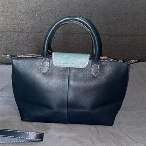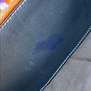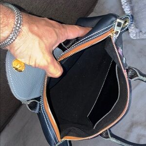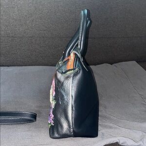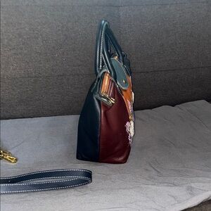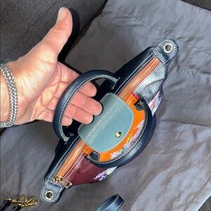 This elegant leather handbag features a stunning floral design with a blend of dark navy blue, orange, burgundy, silver, teal, and purple and pink hues. Pearls and crystals make up the two hearts on the front of the bag. Removable and adjustable navy blue leather crossbody strap. Gold tone hardware. Zipper top closure. Interior has a black fabric lining with one leather open slip pocket and a zipper pocket.Perfect for adding a touch of sophistication to any outfit. Now the bag itself has no name or label anywhere on the bag, but on the side of the top zipper pull it is embossed LOEWE…… LOEWE is one of the few high end luxury brands that I know very little about. The bag is made out of great quality leather and the hardware is very good quality as well as the stitching. I’m 99% sure that this was hand painted. Very similar design to the Longchamp le Lepage shopping tote. Stunning and very well made super soft leather handbag.