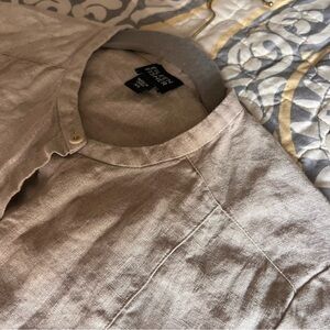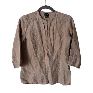 Eileen Fisher Tan Linen Mandarin Collar Button Down, 3 Quarter Sleeve Top, XS