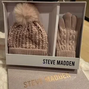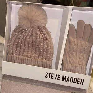 Chic blush beanie with pom-pom. Matching knit gloves included. Ideal for winter wear.