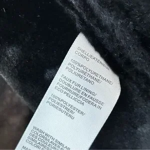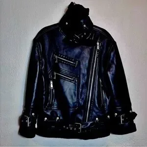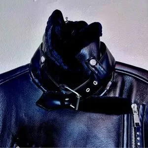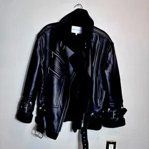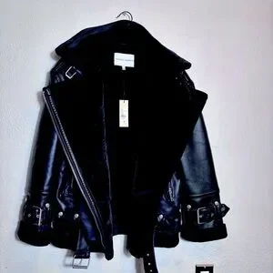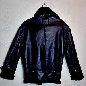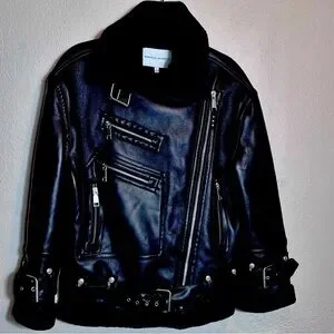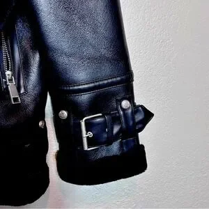 Luxurious and stylish black faux fur jacket. Soft texture with elegant design. Absolutely the most cozy, comfortable faux leather oversized moto jacket you will ever own! Can be dressed up or down. Will keep you warm, lined with soft luxurious fur throughout. Size is small, but would fit medium as well. Seriously, it is very cool!!!