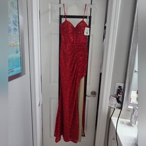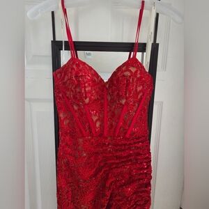 Dripping in sexy details, this allover lace sheath features a sweetheart neckline, corset-inspired bodice, and thigh-high skirt slit. It's versatility should be celebrated, so debut (or rewear!) this style as a wedding guest dress, prom dress, or formal event attire.