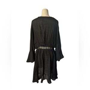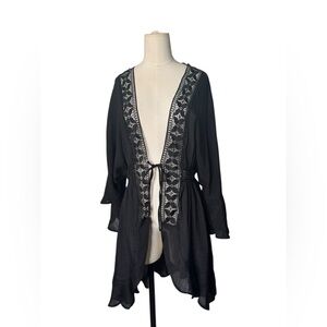 Elegant and effortlessly chic, this Love Tree black open-front cardigan features beautiful crochet lace trim detailing along the front and waist for a feminine boho touch. Designed with a lightweight, flowy fabric and wide bell sleeves, it drapes beautifully over dresses, jumpsuits, or casual outfits. The adjustable front tie closure adds shape while maintaining a relaxed silhouette.