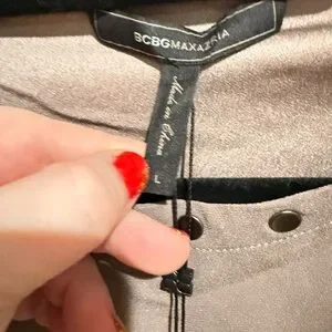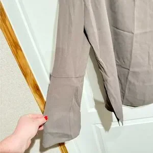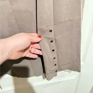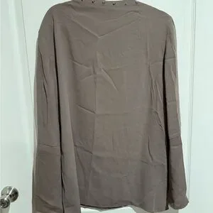 Elegant metallic taupe top with button details. Ideal for versatile styling.