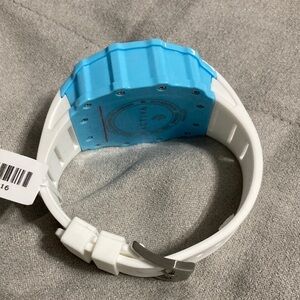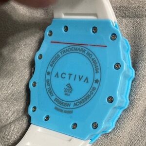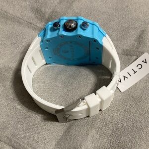 Stylish Activa watch with a blue bezel and white strap. Features a detailed dial.