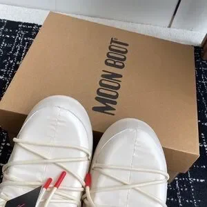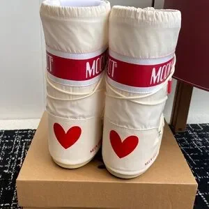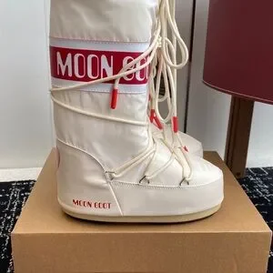 Stay stylish and warm with these Moon Boot women's snow boots. Featuring a chic cream color with bold red accents, these boots are perfect for winter adventures. Enjoy comfort and fashion in every step.