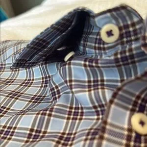 This David Donahue blue shirt features a stylish plaid pattern in purple and brown, perfect for casual outings. Made from comfortable materials, it offers a relaxed fit ideal for everyday wear. Its classic design ensures a versatile addition to any wardrobe. Has hidden button down collar.