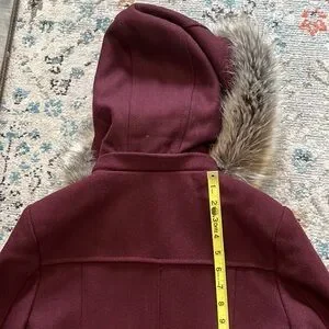 Gorgeous, stylish wool blend duffle/pea coat. Large appliqué patches at chest and waist. Faux fur trimmed hood detachable by zipper. Fold over collar. Front black metal zip closure with snap-front placket. Long sleeves. Side hand pockets. Snap accents at cuffs. Fully lined. Straight hem. Fitted styling.