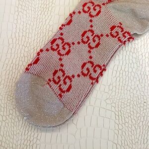 Brand New Gucci GG Glitter Socks Taupe with Red GG Pattern
