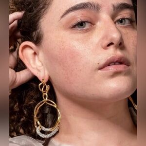 Liquid metalwork plated in 14-karat gold and drenched in crystals delivers contemporary sculptural shine to these drop earrings.