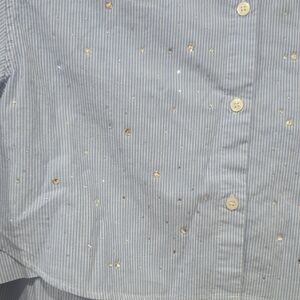 Elegant light blue shirt with button-down design. Features a classic collar and cropped style. Ideal for both casual and office wear.
