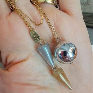 Long chain with round silver bauble on one end and 2 double cone shaped baubles on other end.