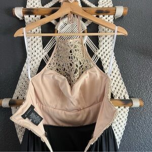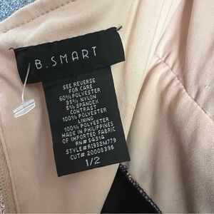 The B Smart Prom Dress in size 1/2 is a stunning hi-low dress with a gold rhinestone and beaded accents, perfect for a formal occasion like a wedding, party, or prom. The black dress features a halter neckline, sleeveless design, and a zip closure for a secure fit. Made from chiffon fabric, this elegant ball gown exudes a formal and vintage look, ideal for juniors looking for a chic and sophisticated outfit for special events. Designed in the 2000s with a babydoll style and strapless detail, this dress is sure to make a statement and turn heads wherever you go.