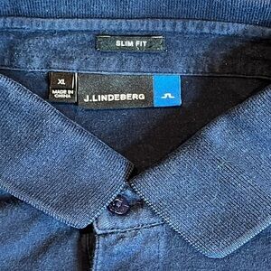 J. Lindeberg striped slim fit polo shirt. Navy blue with orange, white and tan stripes. Size XL, measurements are 22 inches across, and 28 inches long. 100% cotton. No stains or snags, some slight pilling, easily removed.