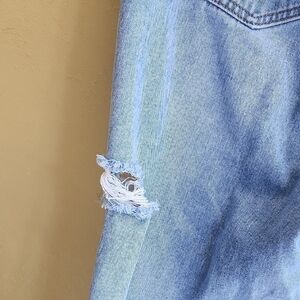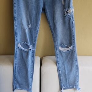 Trendy light blue jeans with distressed details. Straight leg design. Perfect for casual outings.