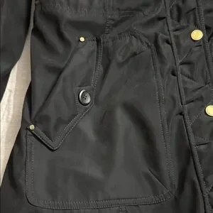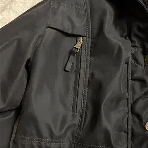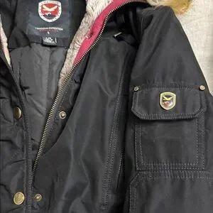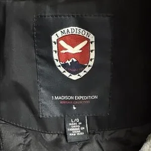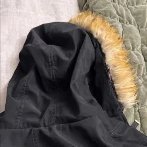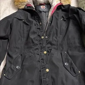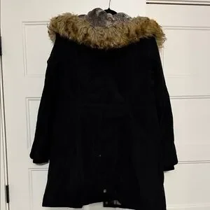 Chic black coat by Madison. Features a cozy faux fur hood and lots of pockets. Ideal for winter adventures. Zips and snaps up. Nice and warm from smoke free home. Only worn a couple of times.