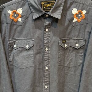 Howler Brothers Charcoal Shirt w/ Hibiscus Flowers - Floral Embroidery - MEDIUM