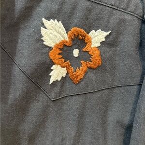 Excellent Condition- Size Medium- Charcoal shirt with striking floral embroidery. Features orange and white floral accents.
