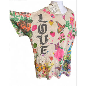 This iconic Magnolia Pearl tee features a whimsical, hand-art style print with butterflies, florals, strawberries, birds, and “LOVE” typography throughout. Soft, lightweight cotton jersey with Magnolia Pearl’s signature relaxed, lived-in aesthetic.