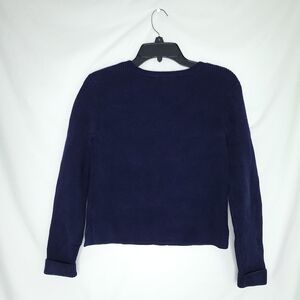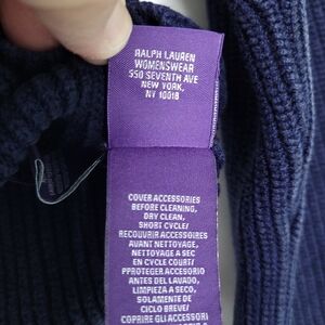 Beautiful navy blue sweater from the Ralph Lauren purple label luxury line. Made in Italy from luxuriously soft silk. Has 3 buttons on left shoulder. Minimalist style. Please check measurements as this does run small. Could be considered slightly cropped. Garment does have some light fading. There 's some fading on the right sleeve on front & back (see last 2 photos). This isn't visible if you roll the cuff. Please view all photos. Retails for around $1200.