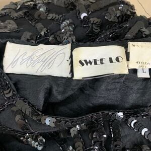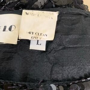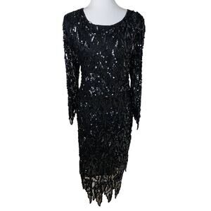 Stunning vintage Sweet Love beaded dress crafted from 100% silk with intricate allover black sequins and beadwork. This elegant piece features a sheer silk overlay, long semi-sheer sleeves, and a beautifully scalloped hemline with dimensional beaded detail.