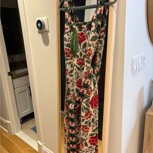 Charming maxi dress with bold floral design. Features striking red and green hues. Ideal for any event.