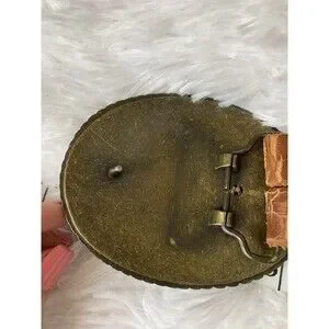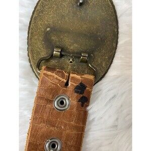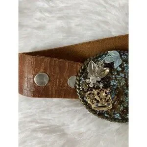 Genuine Leather Belt Women Size 38 Rhinestone Oval Buckle Brown Western missing some rhinestones Buckle is heavy Width 2 inches pre owned see pictures for more details and measurements