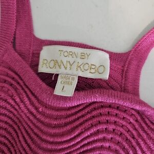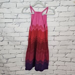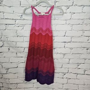 The Hope dress from Torn by Ronny Kobo is a fitted stretch knit dress. It has a colorful wave pattern and scallop hem. It has skinny straps and a racerback. It is in good used condition.