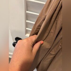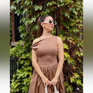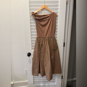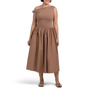 Trendy brown midi dress. Flattering off shoulder cut. Fitted, stretchy fabric on top with a cotton poplin skirt. Side pockets. Elastic waistband.