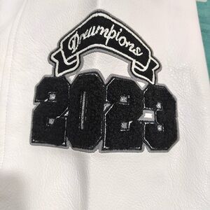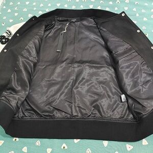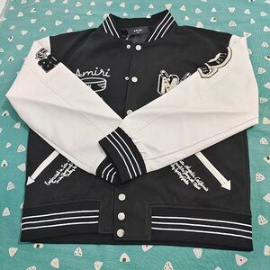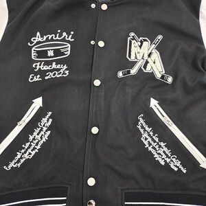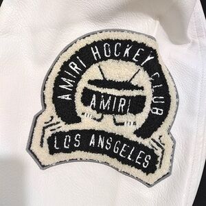 The terry cloth embroidery depicts a scene of ice hockey players battling it out, paired with the words ""AMIRI FIGHTERS FOREVER,"" creating a strong visual impact.
