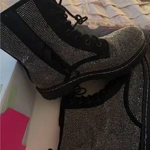 Stylish black combat boots with sparkling rhinestones. Perfect for a bold look.