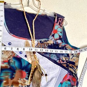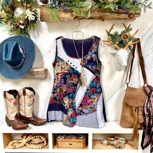 Artisan patchwork tunic/mini dress w farmhouse peasant prairie vibe this gem is multifunctional can be used as mini dress or tunic fits like a S/M pls see measurements