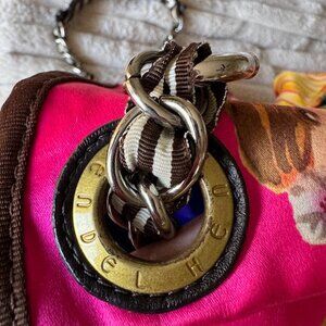 Vibrant tote with stylish illustrations. Features chain handles. Perfect for fashion enthusiasts.