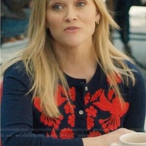 Elegant navy cardigan featuring vibrant red floral embroidery. Perfect for adding a touch of sophistication to any outfit.