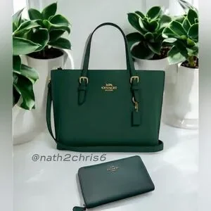 Coach Mollie Tote 25 Bag in Everglades Green & Leather Coach ID Zip Wallet.
