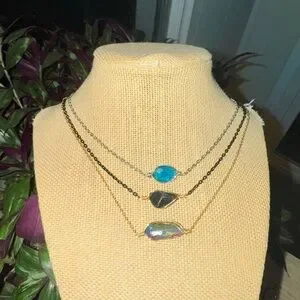 In show layers!! This stunning necklace set features vibrant blue, black, and iridescent stones. Perfect for adding a touch of elegance to any outfit.