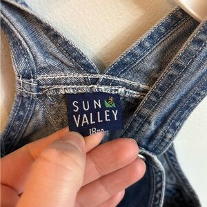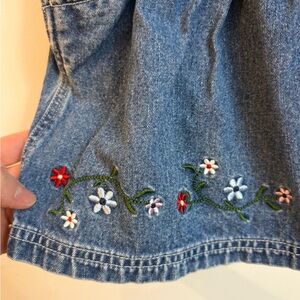 Charming denim overall dress for kids featuring colorful floral embroidery. Perfect for playful days. In very good condition