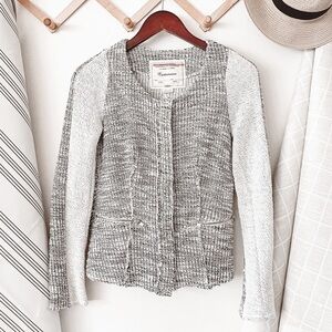 Featured with buttons up the front and a tweed knit fabric throughout. Also includes two zippered pockets on the waist. Gray & ivory in color. Excellent shape!