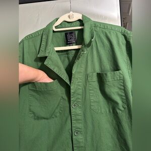I ADORE this color and this piece- I wish it fit me! Gorgeous green, hearty pockets. Collared neckline, short sleeves, and long pant legs. Button up, features a little bit of an elasticized waist. No zippers, has a few extra buttons attached to the care tag.