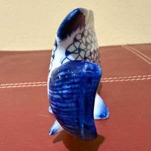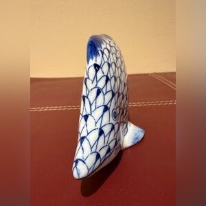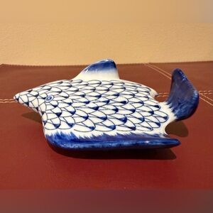 Beautiful ceramic fish figurine in blue and white. Intricate fishnet design adds elegance.