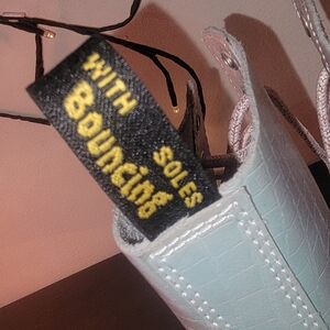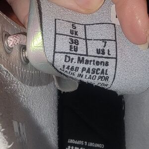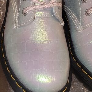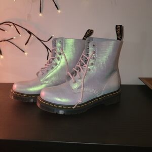 Doc Martens Pascal 1460 lace-up in iridescent croc print, ladies size 7, never worn outside but tried on and walked around in inside. No tags or box. They have pink sparkly laces, clean insole footbed and clean soles. Round toe and signature yellow Doc Martens lacing, Air Wair (bouncing) insoles.