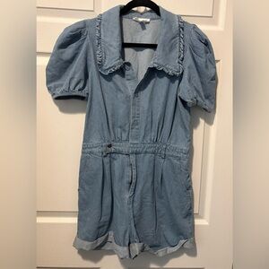 Stylish and comfortable denim blue romper perfect for casual outings. Features a classic design with short sleeves and a button-up front.
