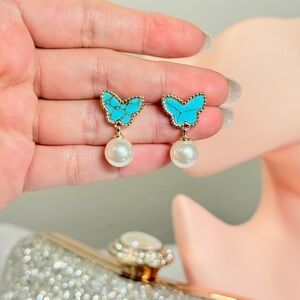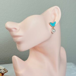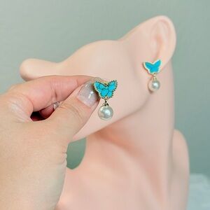 Charming turquoise butterfly earrings with elegant pearls. Gold accents add a luxurious touch.