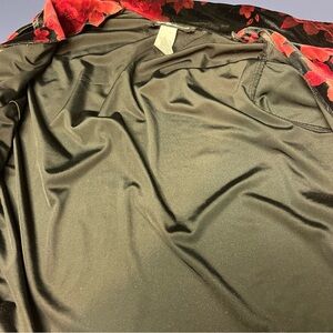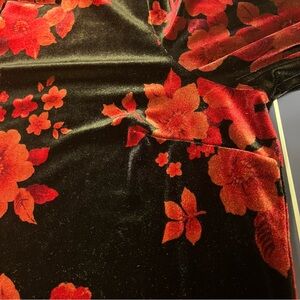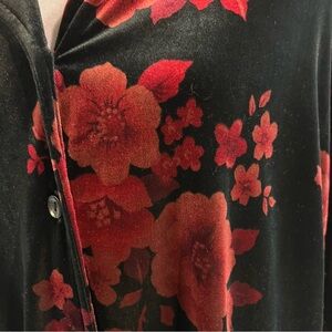 Chic black velvet shirt with striking red floral accents. Features a stylish collar and button-up closure.