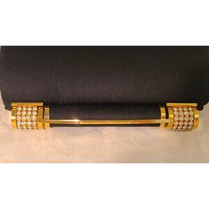 Gorgeous VINTAGE RODO Made in Italy Luxurious Black Satin Evening Clutch with Stunning Gold-Tone Frame and Rhinestone Crystal Embellished Clasp. This Elegant Hard Case Minaudiere features a Secure Push Clasp, Signature RODO Logo Lining