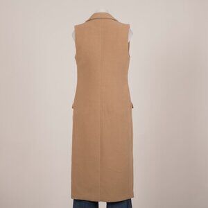 Sleeveless longline vest by Missguided in a camel neutral tone. Tailored silhouette with a double-breasted front, notched lapels, and decorative flap pockets. Fully lined with a smooth interior and designed to layer easily over knits or blouses. Straight cut with a clean, structured finish.