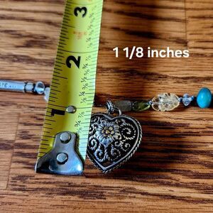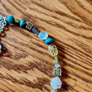 Special Features: Lovely Puff Filigree Heart with Gold Center, beautiful variety of Semi Precious Beads in Blue, Amber, Yellow, White, Opaque, Turquoise, and Silver with Gold Floral Accents, Various Shapes and sizes in an Alternating Pattern, Sentiment of "Share..." Silver bead, lobster claw clasp, extension, Brighton charm at nape. Gorgeous Piece! 💓