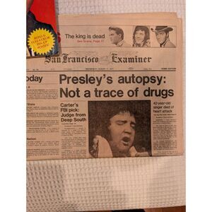 San Francisco Examiner – August 17, 1977 headline: Presley’s autopsy: Not a trace of drugs