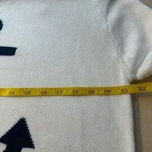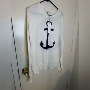 Chic white sweater with a striking navy anchor design. Ideal for casual wear.