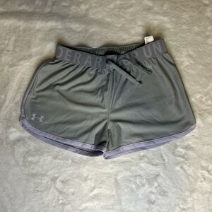 Under Armour girls' shorts in size Large. Gray with purple accents. Features a comfortable design and adjustable waistband, ideal for workouts.