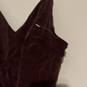 Elegant burgundy slip dress with a sleek silhouette. Features thin straps and a v-neckline. Small side slit on the assymetrical hem. Perfect for any occasion. Material has a soft sueded feel. Size small.